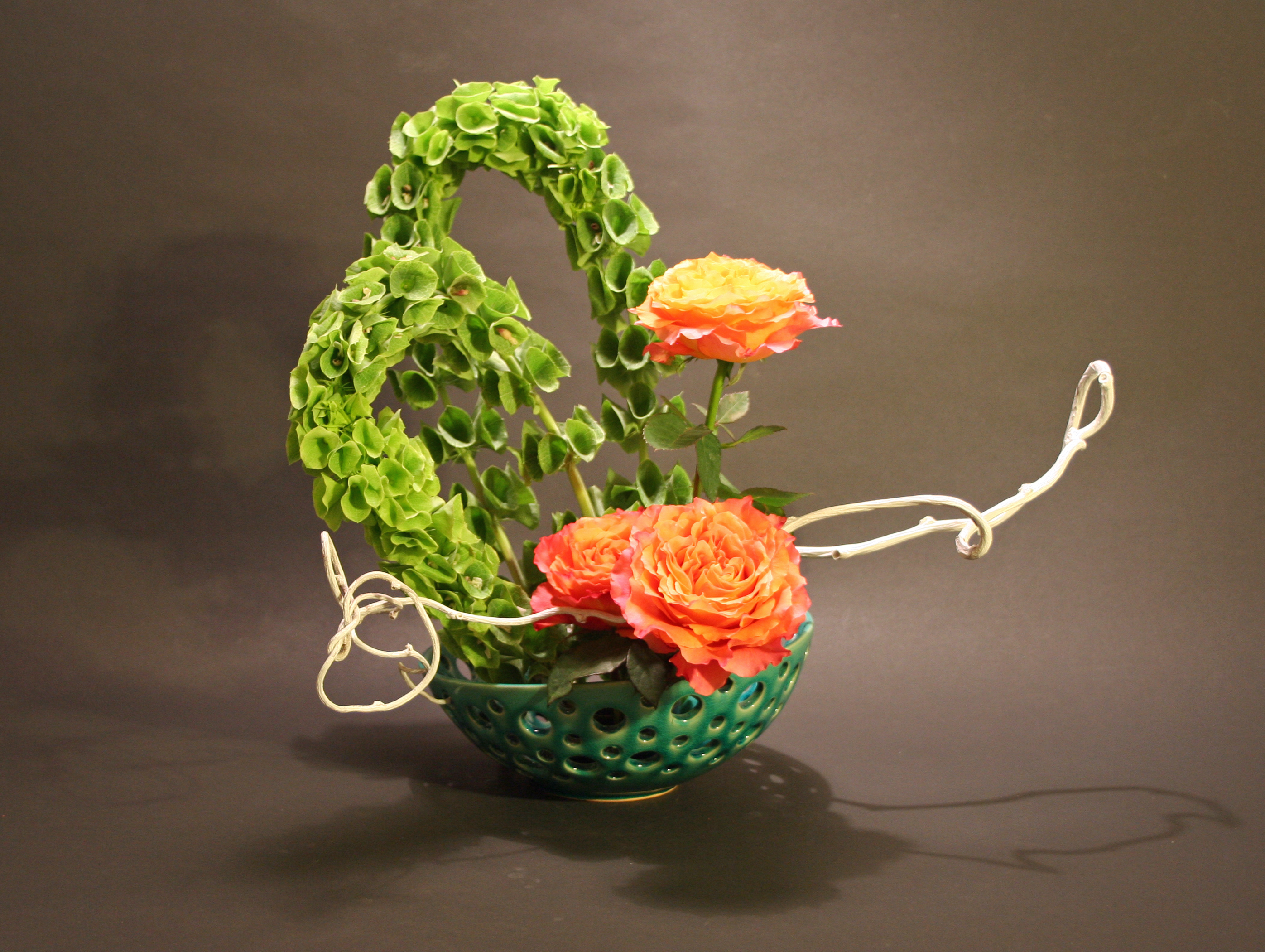 Bells of Ireland can be tricky to use, very often they are either straight or curved but they are unique in that they can be easily reshaped to get the shape you desire. I bent two of them and wove them together to form one large circular form, and then repeated that shape again. The extremely fragrant orange roses are the variety “Free Spirit”, and the last material is colored white kiwi branches. I wanted to work with the odd curve of the top of the bowl, it’s actually higher on one side than the other. So it has a unique shape, and the different size holes in it also add more to the circular theme.
