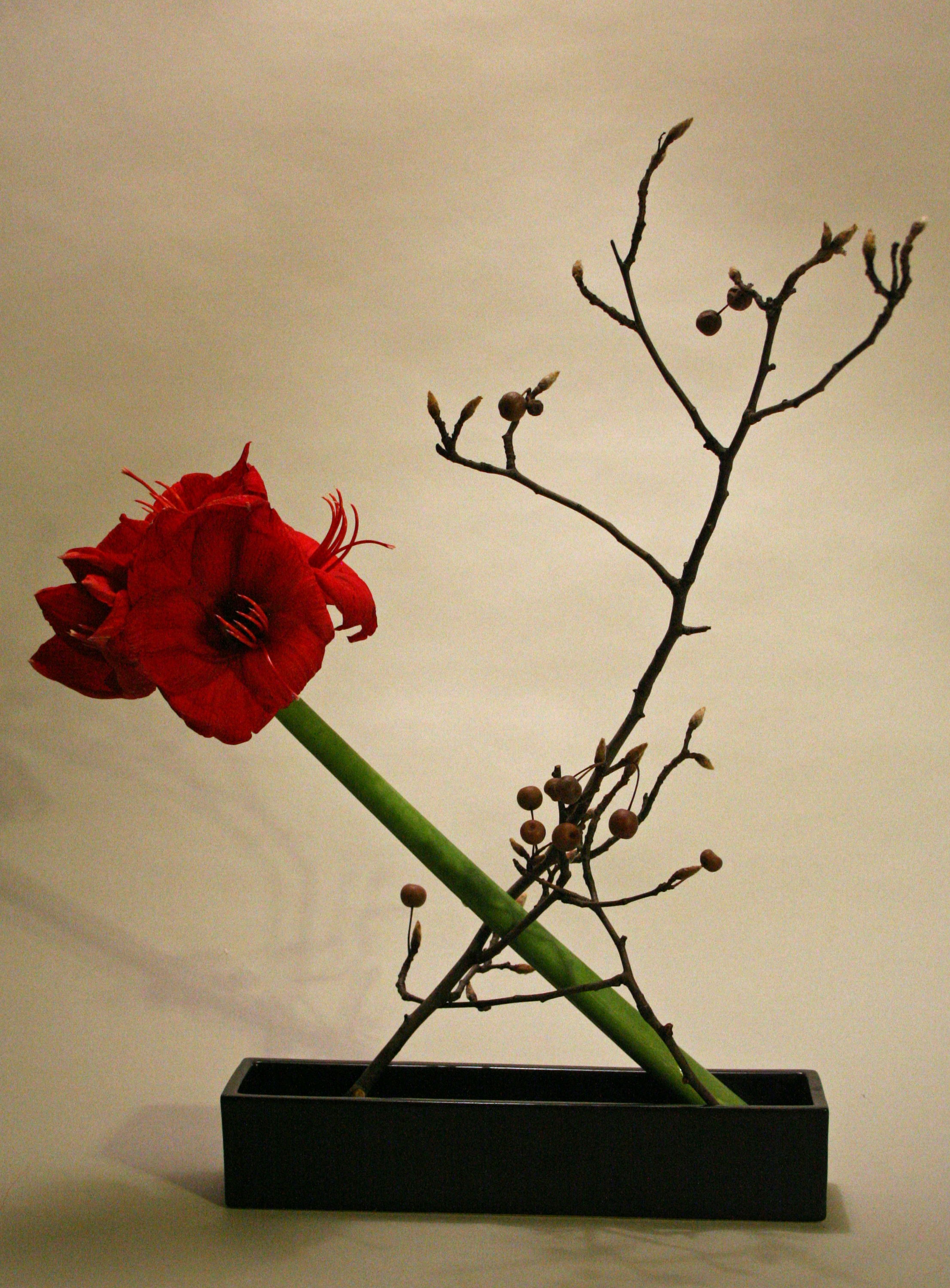 Ikebana wihtout using a kenzan, it’s a pretty simple concept but not quite so easy to do. It’a all about balance, and working to interlace the materials to get them to stand while adding more materials. This one looks simple, but it’s still difficult because there are only two bradford pear branches and one stem of amaryllis. It’s getting them in place and standing that takes a bit of patience. No wire or any material is used to hold things in place, it’s all interlaced branches and stems. More and more this is becoming one of my favorite ikebana methods. It’s fun to work the materials together and be free from using a kenzan, it gives me a more open expressive piece I think.