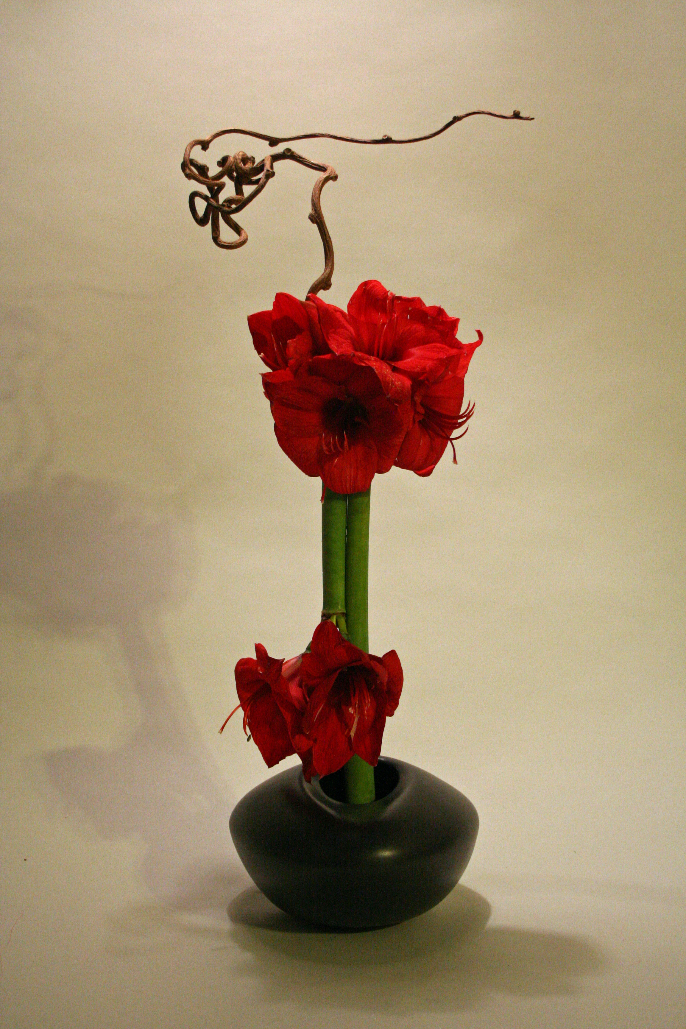 In the freestyle ikebana I did today there are two stems of red amaryllis, one is straight up and the other is inverted in an upside down position. The upside down stem is wired in two places to the taller upright stem, to keep the upside down bloom fresh you simply add some water into the hollow stem. The finishing touch is a stem of kiwi vine, to add some interest and movement.