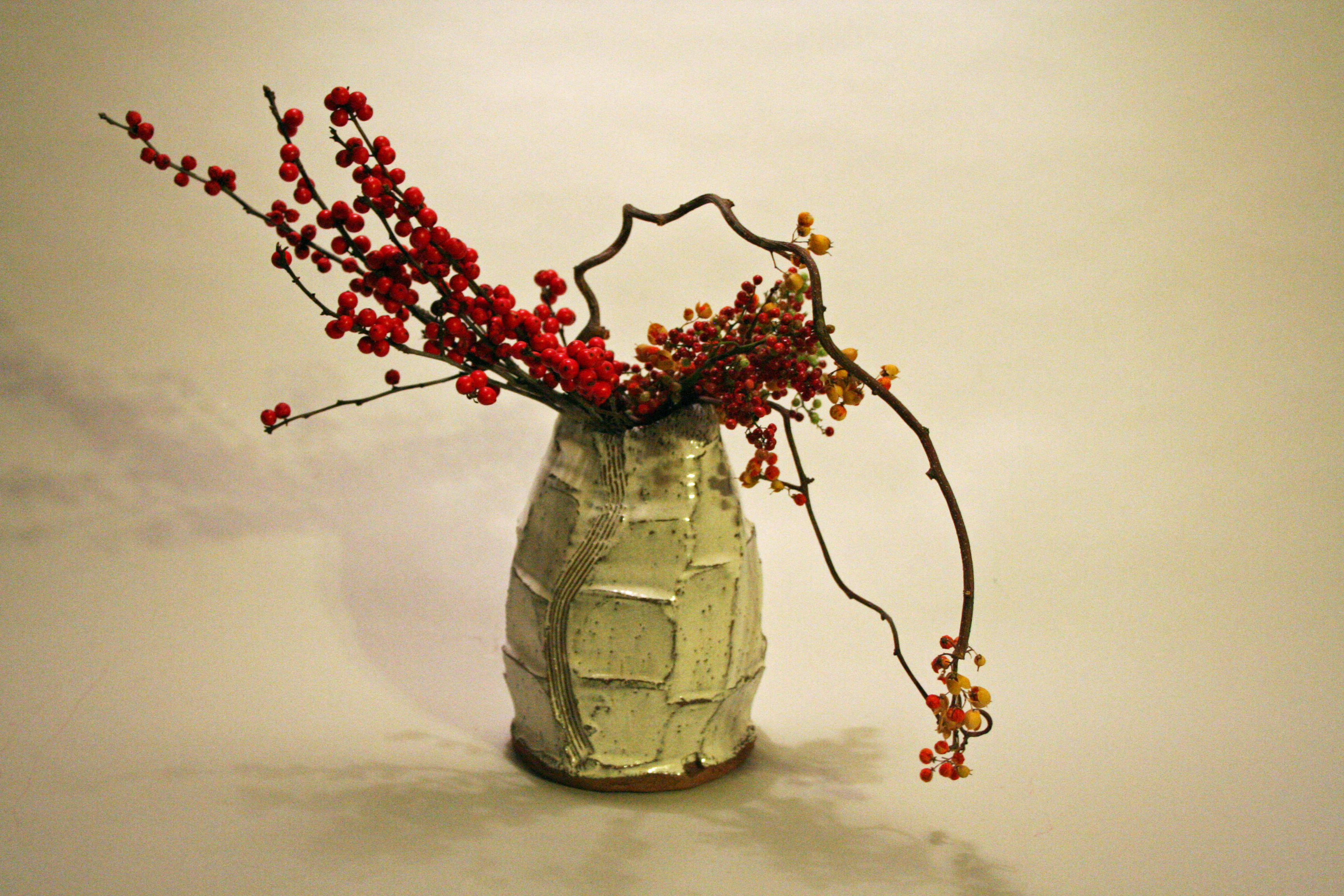Winter berries are always plentiful this time of year so I thought I would do something with them. The combination of winter berries (ilex) and pepper berries seemed too close in color so I added some bitterswwet for contrast and to get some movement with the twisting vine. It’s simple and understated for a winter display of ikebana.