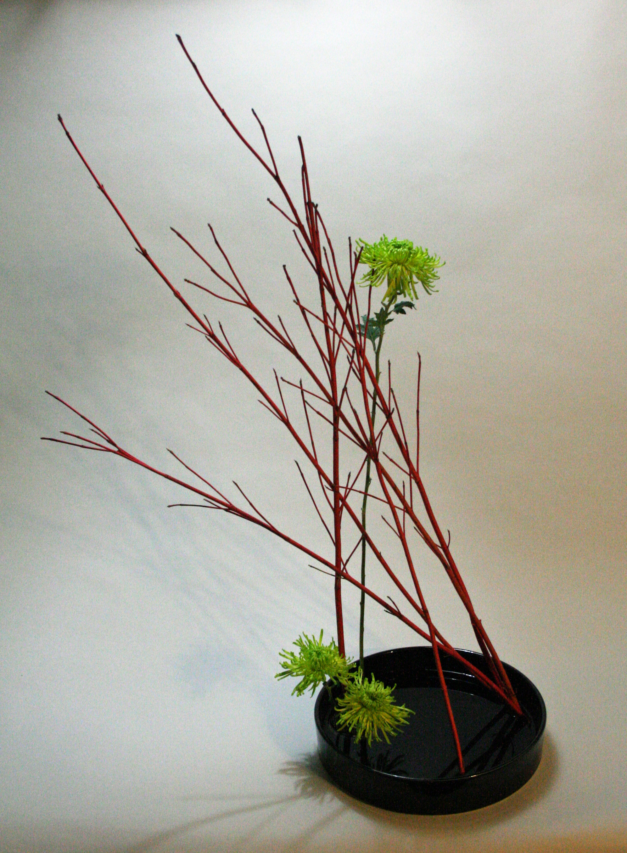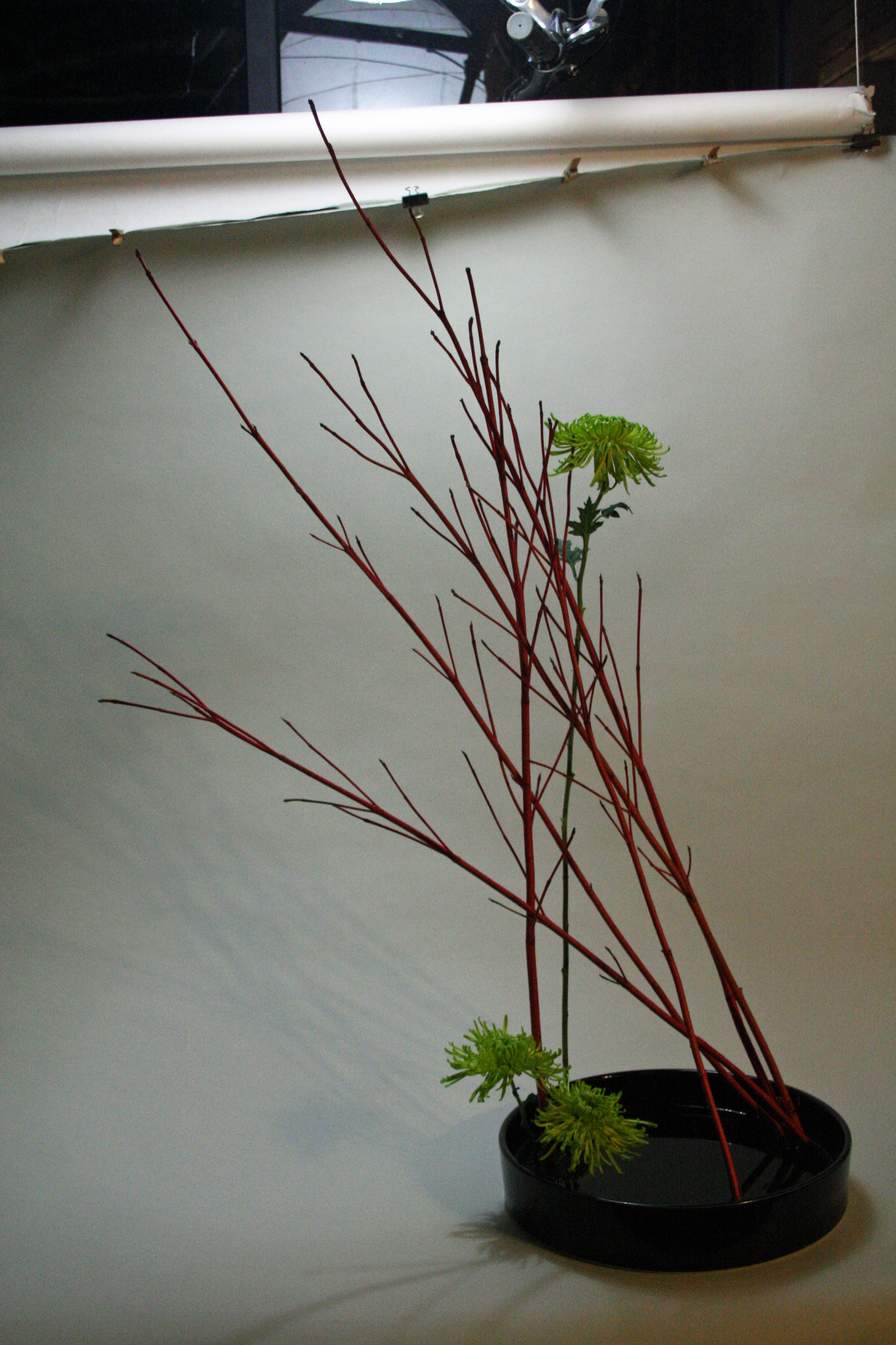 Ikebana with staight lines from my Sogetsu ikebana class tonight, it was too big to get a photograph during class so I had to bring it home and remake it. Still it was too big to photograph straight on so I stood on a chair. The materials I used are red stick dogwood branches and green chrysanthemums. Below is the original version: