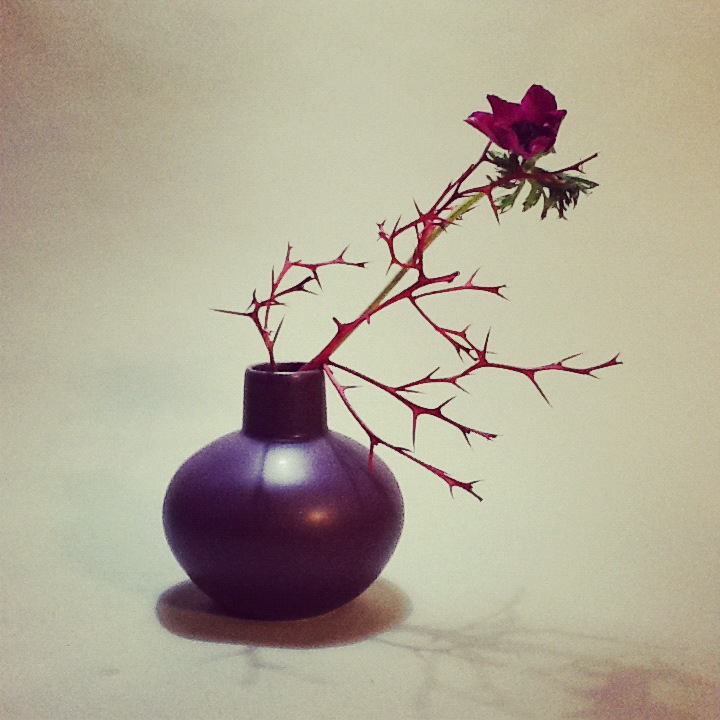 Some days the ikebana arranging is not so easy, today was one of them. I worked on one design for about 90 minutes, and by the end it looked tortured. In fact it had been. I tried to get the materials to bend to my will, all the quince and other branches had been inserted and taken out and moved and put back in over and over again. It was like trying to make the pieces of a jigsaw puzzle fit into the wrong place, and I should have recognized it after the first half hour. My lesson for today was to learn to not force things and to simplify when needed. So I instead chose a different container, painted trifoliate orange branch and a stem of anemone and did something very simple. Lesson learned.