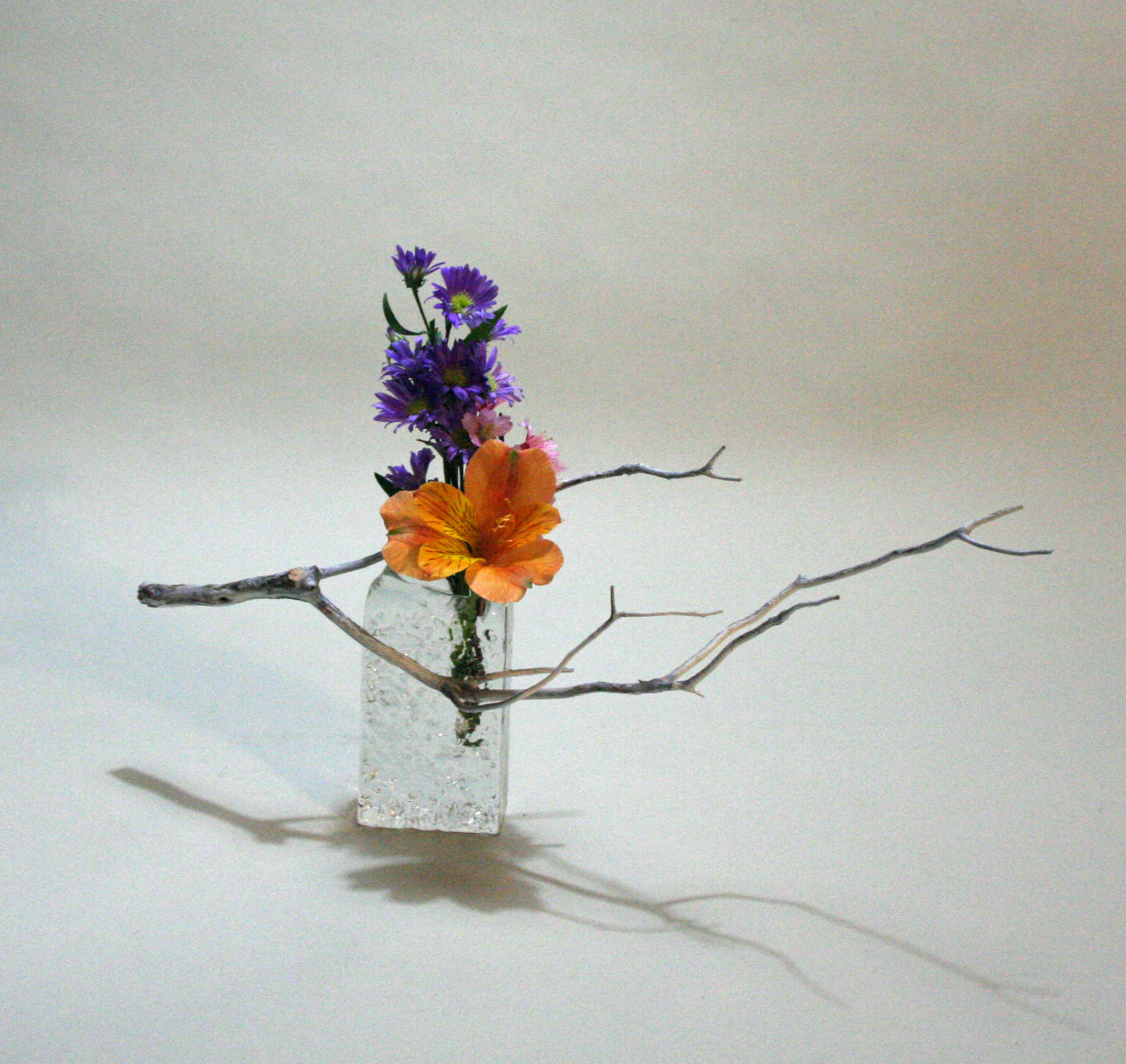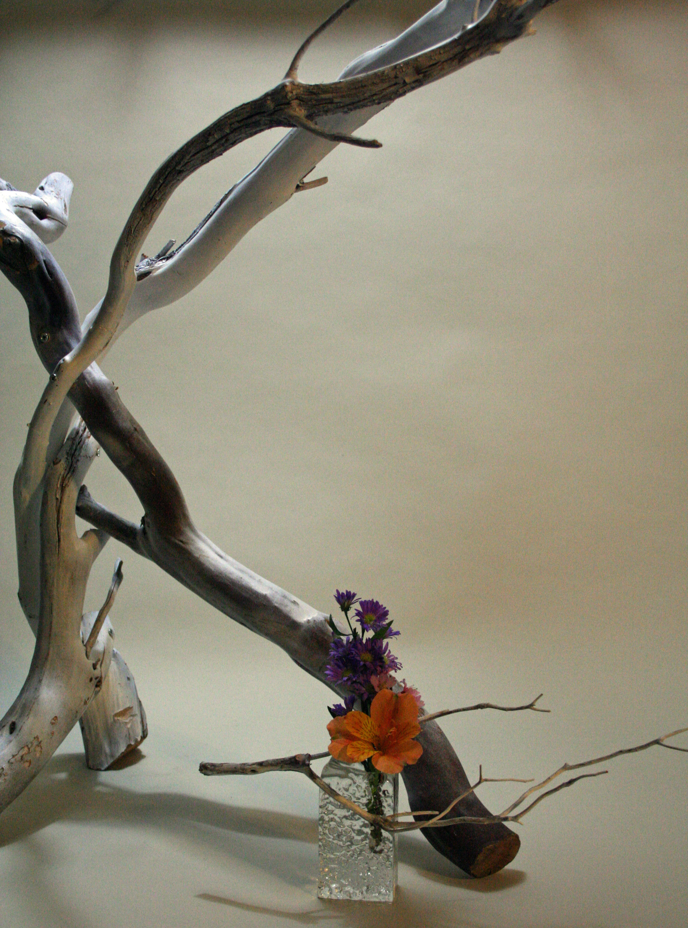 It’s a quick short post with a small arrangement tonight. The miniature ikebana was done after sending most of my time working on a larger structure for later next week. To make it a bit more interesting I photographed part of the larger piece with the miniature and posted it below.