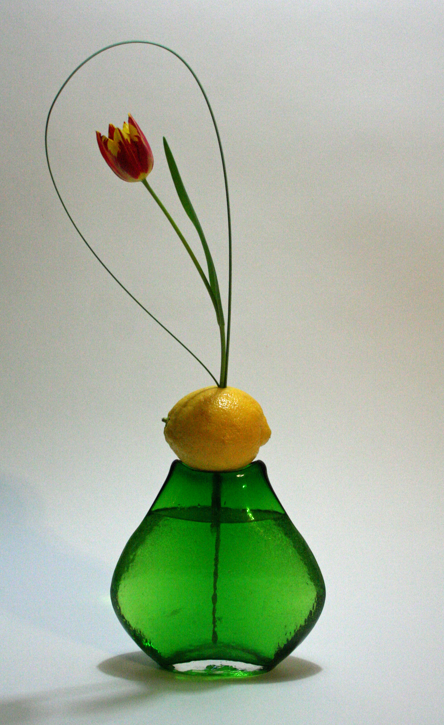 This green glass vase is one that I love, it has a great shape and the glowing green from the light going through the vase gives me a lift. I think using the lemon as the hana kubari works quite well, it uses form and function to add value to the design. With the addition of the yellow/red tulip the combination of the colors red, yellow and green create a harmonious design. Hopefully I’ll have more tulips(and some iris) to use in the next few days.