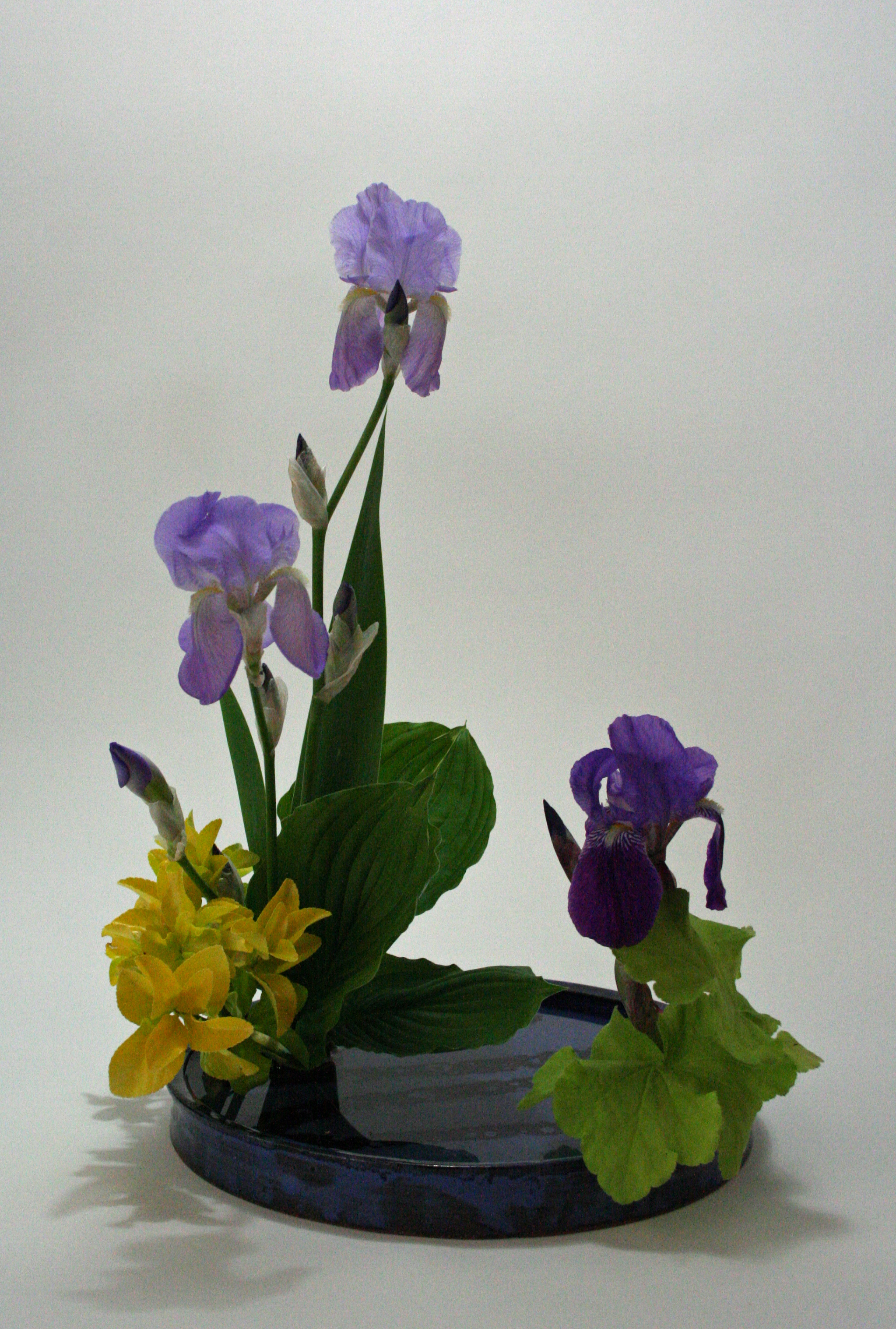 Iris in bloom from the garden inspired my moribana today, lighter blue on the left and darker blue one on the right. A touch of yellow euonymous, chartreuse heuchera and some new leaves of hosta brings it all together over the water. Tranquil and refreshing.