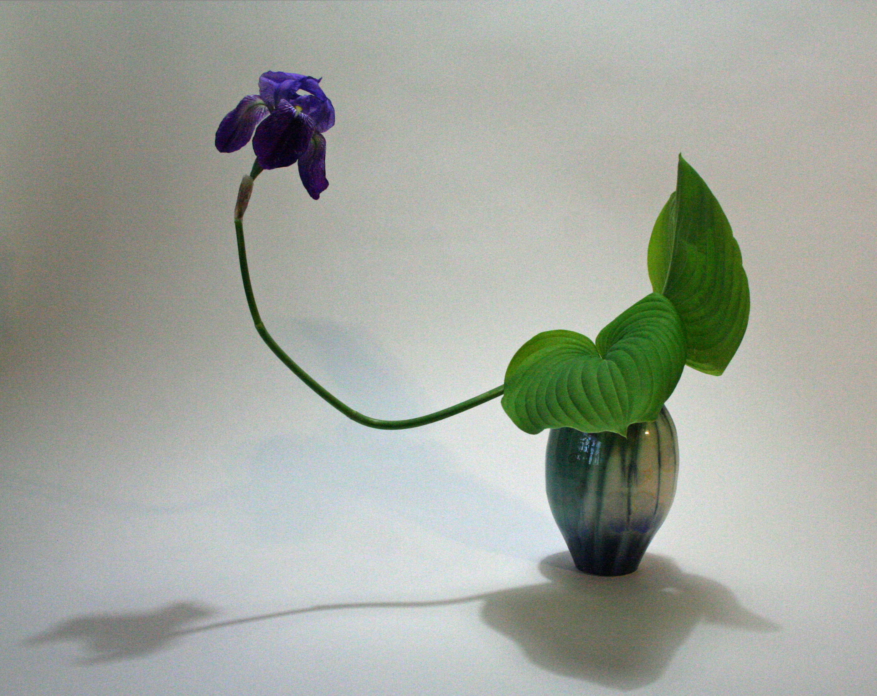 I found this curved iris stem in the garden today, mostly bloomed out except the last bloom at the tip. It has a great curved shape, and it looks great with the hosta leaves that have opened. Each day I go out to see if the hostas have opened, eager to collect their leaves. It’s probably a good thing that we have a lot planted, but I still think we need more. In my opinion there is no such thing as having too many hostas. The great colors and variagations, large and small leaves, and the shape make them a must for the ikebana garden.