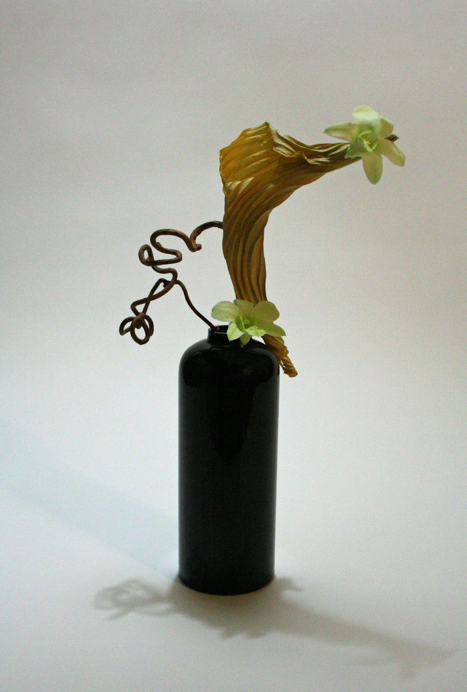 Each day I am looking for materials that inspire me, or try to find some element that interests me to use in my work. Today the dried hosta leaf from one of the ikebana arrangements made a few days ago was my starting point. I liked the way it had dried, the shape, the color, the way the veins of the leaf showed. It’s easier for me when I have that interesting starting point that pulls me in and starts the work in a direction. At that point I just play with different combinations of things and use the creative flow that’s begun and let the work take shape.