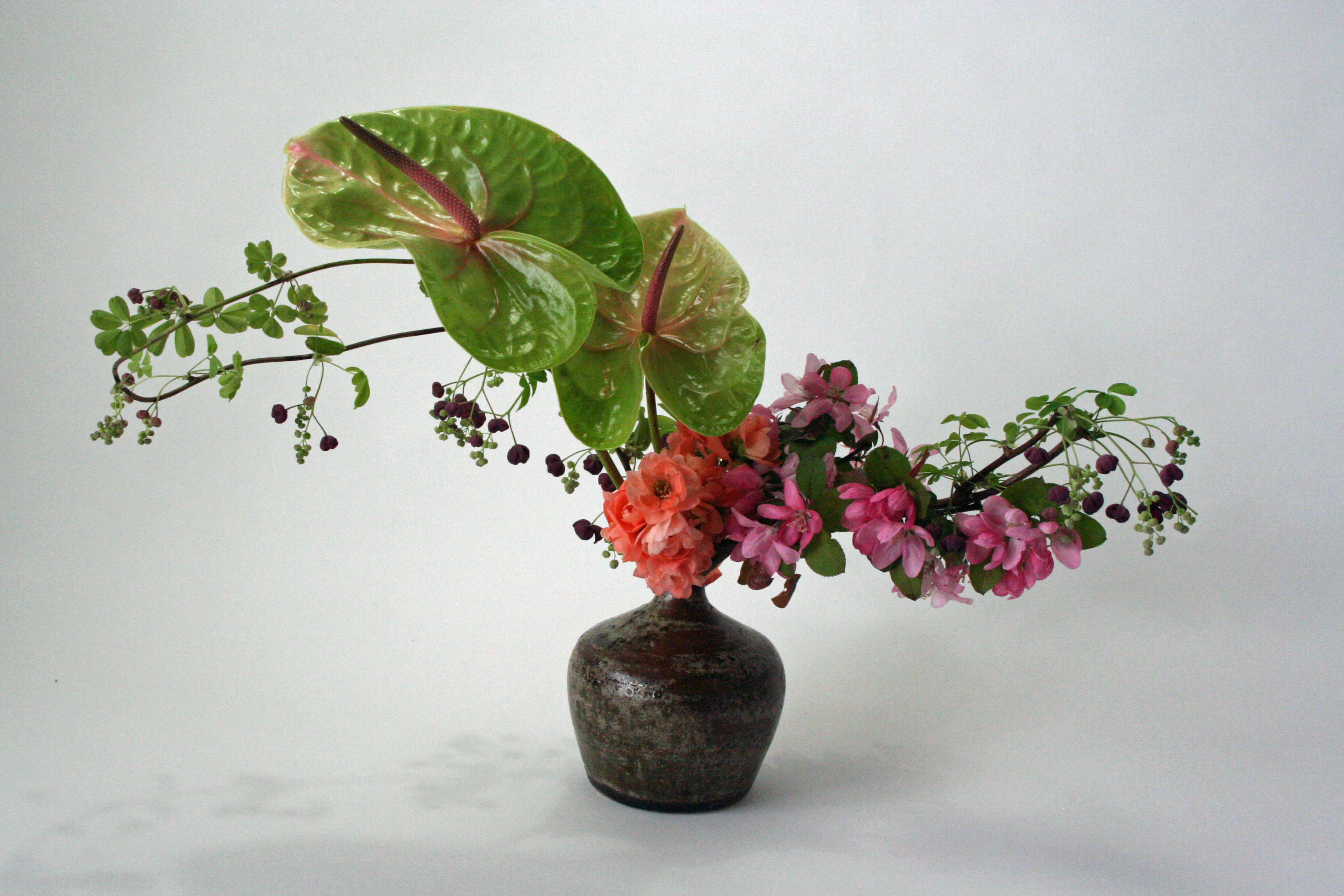 One thought on “Anthurium with Akebia Vine, Peach Quince and Apple Blossoms