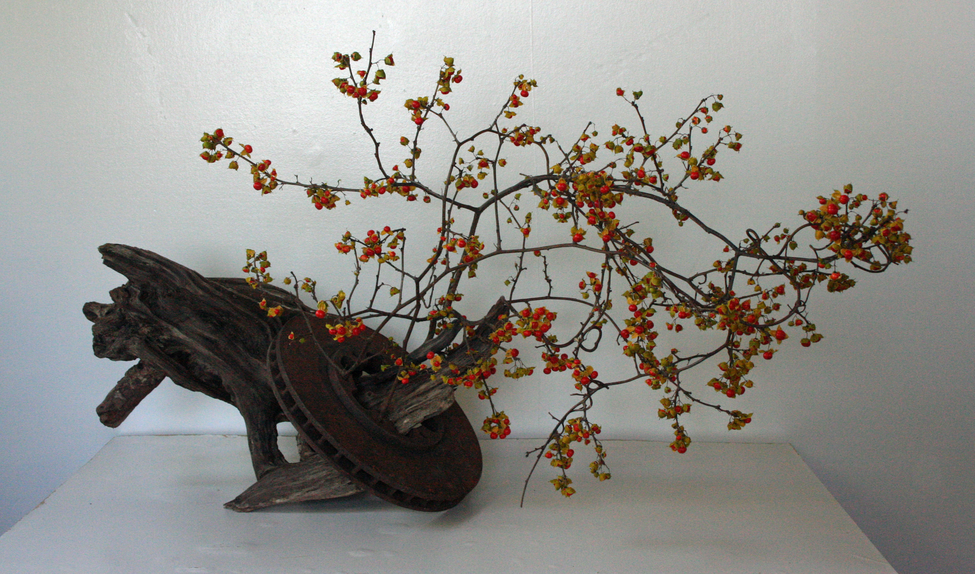 book “Beyond Flowers, Collecting and Arranging Natural Objects”. In this book I found a kindred spirit with things found and collected, and I used that energy to make this piece using all found objects. The bittersweet provided by mother nature, the driftwood from the bay and an old discarded rusted disc came together almost as if they were old friends.