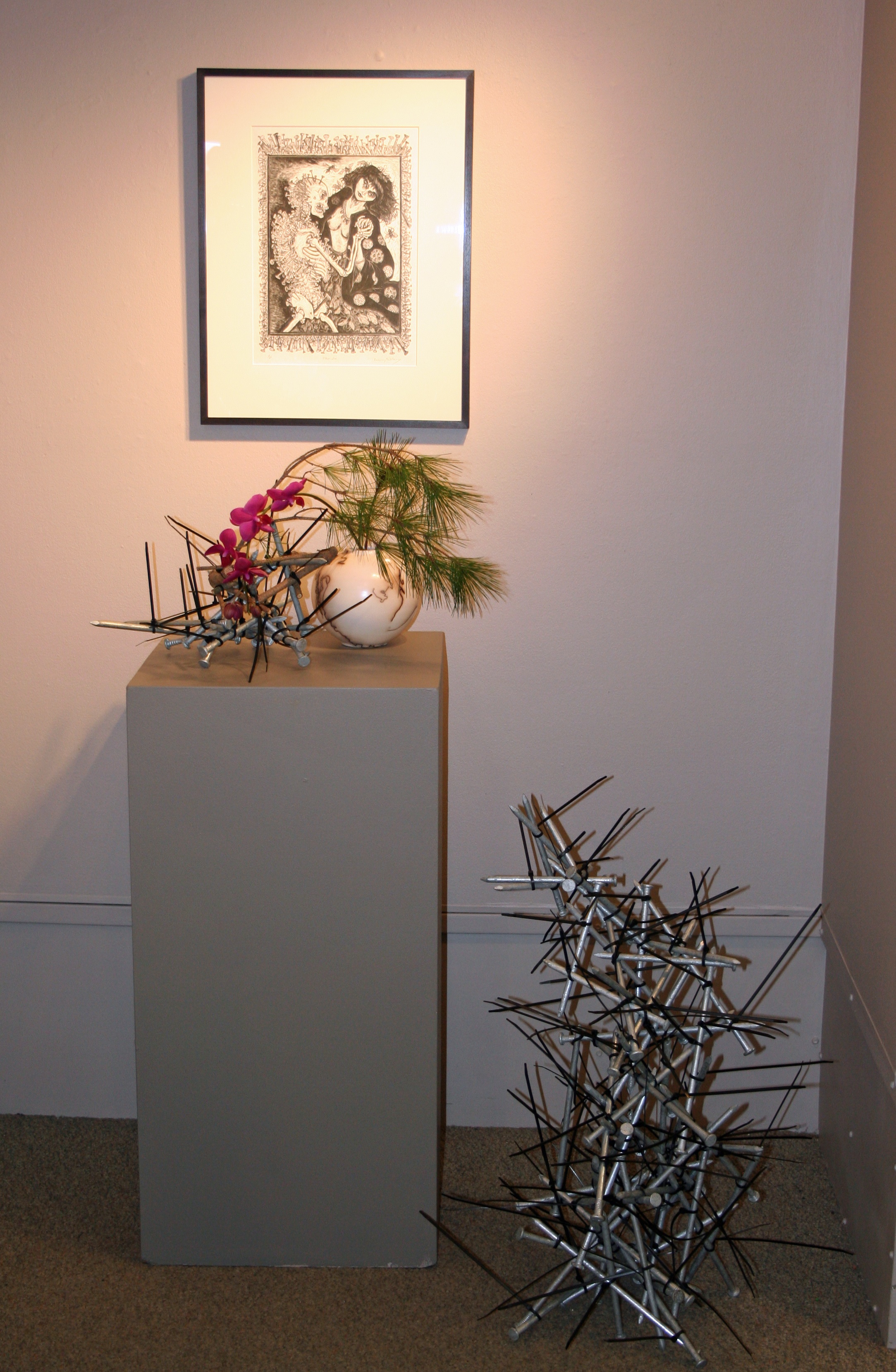 Recognized as a sculptural form of art, Ikebana, the art of Japanese flower arranging, has over 300 schools of thought. Sogetsu Ikebana is a three-dimensional artistic expression composed of flower and plant material arranged in a container. Sogetsu promotes an Ikebana of no limits, in which plant materials of any type may be used and displayed anywhere and in any circumstance. Sogetsu does not encourage students to emulate nature; they encourage students to use lines, hues, and masses provided by nature to inspire their own creations. Combining the arrangements with two and three dimensional artwork results in stunning, contemporary installations.